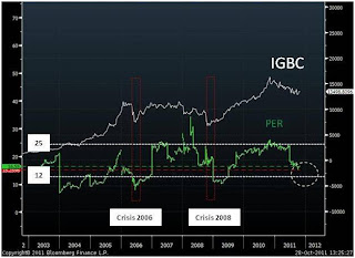 Los rangos extremos para este indicador son 25 y 12. Cada vez que el PER histórico a superado el nivel de 25 o se ubica por debajo del 12 hemos tenido compras y ventas agresivas. Las crisis del 2006 y 2008 llevó este índice hasta PER de 10 donde se inició una recuperación de mas del 50% del activo (nivel actual de 16). La compra del 2005, 2007 y 2010 llevaron el indicador entre 22 y 25 donde también precedió ventas de entre 20% y 50%. Debe estar claro que para que lleguemos a niveles atractivos de 12 o 10 en la situación actual podemos hacerlo con una caída en las acciones de 25% o un aumento de las utilidades de 30%. Ambas situaciones son validas.