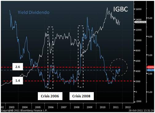 Los rangos extremos para este indicador son 1.4 y 2.6. Cada vez que el Yield histórico a superado el nivel de 2.6 o se ubica por debajo del 1.4 hemos tenido compras y ventas agresivas. Las crisis del 2006 y 2008 llevó este indice hasta Yield 2.6 y 3.0 donde se inició una recuperación de mas del 50% del activo (nivel actual de 2.17). La compra del 2005, 2007 y 2010 llevaron el indicador alrededor de 1.4 donde también precedió ventas de entre 20% y 50%.