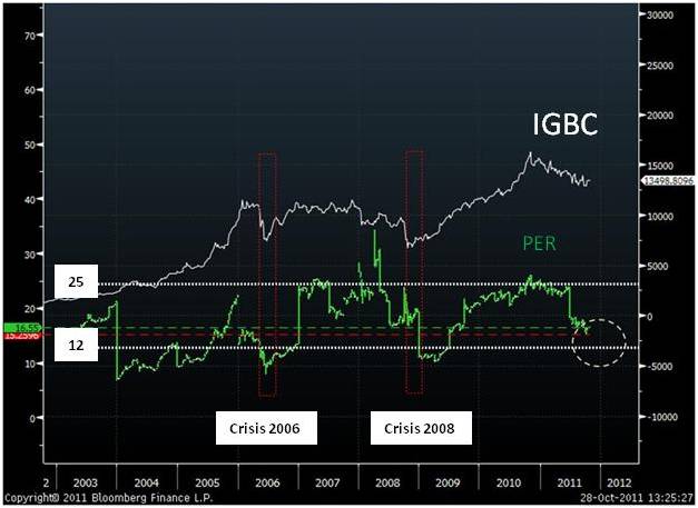 Los rangos extremos para este indicador son 25 y 12. Cada vez que el PER histórico a superado el nivel de 25 o se ubica por debajo del 12 hemos tenido compras y ventas agresivas. Las crisis del 2006 y 2008 llevó este índice hasta PER de 10 donde se inició una recuperación de mas del 50% del activo (nivel actual de 16). La compra del 2005, 2007 y 2010 llevaron el indicador entre 22 y 25 donde también precedió ventas de entre 20% y 50%. Debe estar claro que para que lleguemos a niveles atractivos de 12 o 10 en la situación actual podemos hacerlo con una caída en las acciones de 25% o un aumento de las utilidades de 30%. Ambas situaciones son validas.