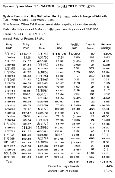Uno de los modelos que el autor propone (estudia, de hecho el autor estudia y prueba varios modelos) es comprar el S&P 500 cuando el cambio entre el yield del año actual y el año anterior sea menor o igual a 6%. Por ejemplo, si el yield del 3-Month T-Bill de hoy fuera de 4% y el yield del 3-Month T-Bill de hace un año fuera 4,26%, esto nos daría señal de compra (o de mantener si ya compramos) ya que el cambio es -6,1%.